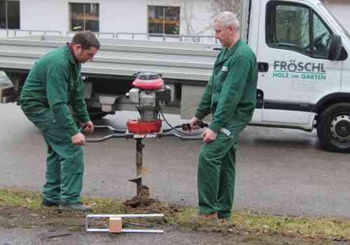 Hochwertige Punktfundamende werden nicht gegraben sondern gebohrt – Durchmesser 22 cm, Tiefe 80 cm: Nach Reinigung des Bohrloches wird die Öffnung mit Beton gefüllt und in den nassen Beton die Steherverankerung versetzt.